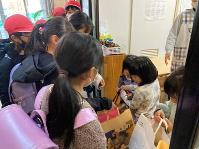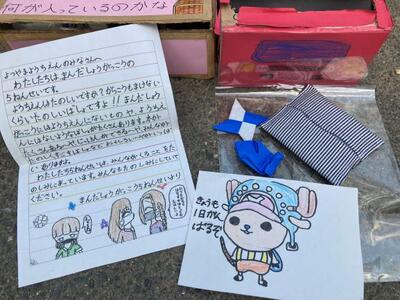 例年、対面方式で交流会を行っているのですが、感染防止対策から交流会ができなくなってしまいました。そこで、子供たちがアイデアを出し合い、プレゼント交流をすることになり、写真のような手作りのプレゼントを渡しに行ってきました。