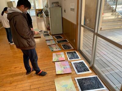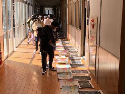 北校舎1階のろうかには、版画と水彩画がずらりと並べられ、5年生の子供たちはそれをじっくりと鑑賞していました。
