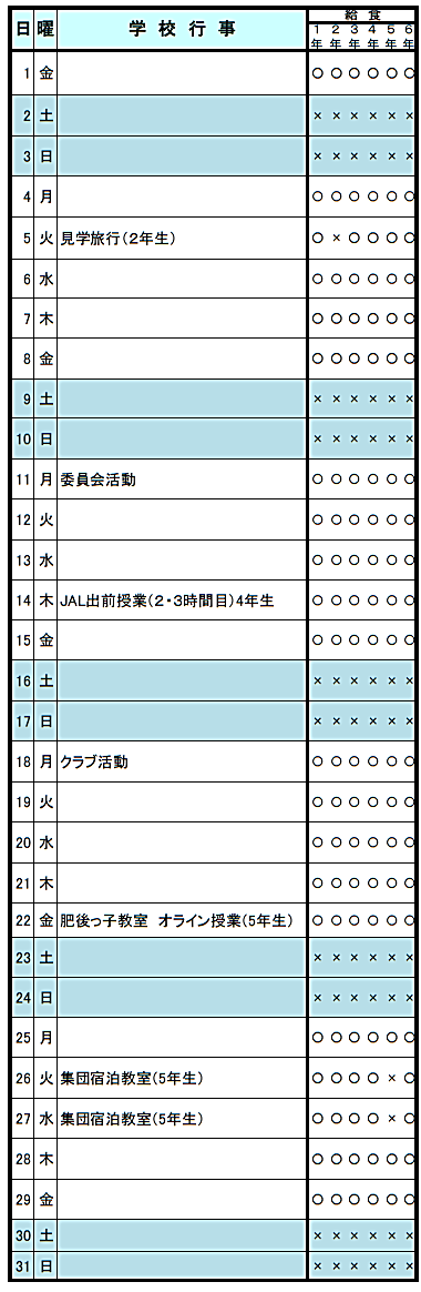 6月の行事予定です。感染症の拡大状況やその他の理由により変更の場合があります。必ず、学級通信にてご確認をお願いします。また、下校時刻につきましても学級通信にてお知らせいたします。