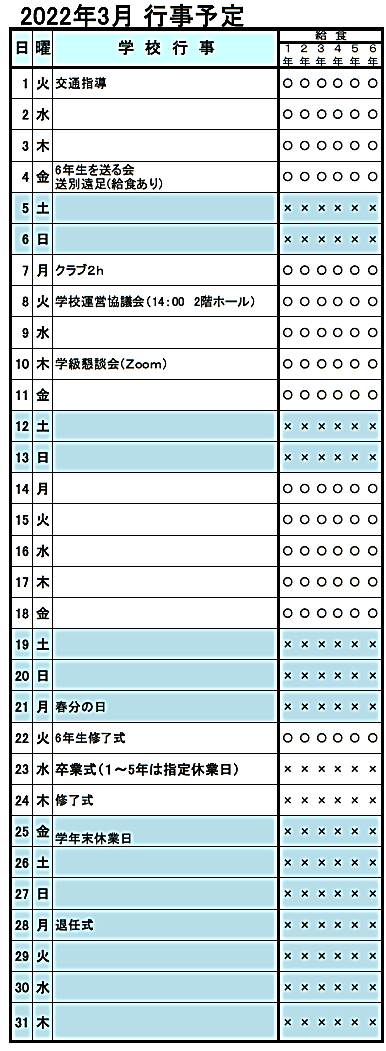 花丸3月の行事予定です。感染症の拡大状況やその他の理由により変更になる場合があります。必ず、学級通信にてご確認をお願いします。また、下校時刻につきましても学級通信にてお知らせいたします。