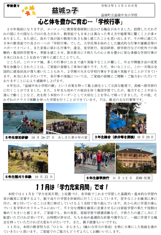 10月10日、11日に6年生が修学旅行に行きました。1日目は講話やフィールドワーク、平和集会など、長崎の地で平和について今までに学習した内容をさらに深めました。2日目はグラバー園や出島など長崎の歴史や文化について学びました。宇宙科学館にも行き、とても楽しい旅行になりました。