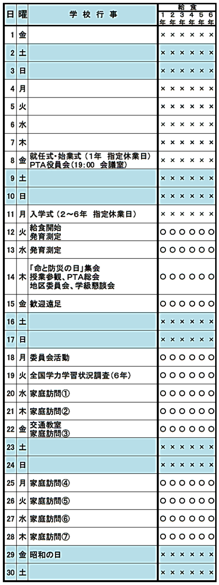 4月の行事予定です。感染症の拡大状況やその他の理由により変更の場合があります。必ず、学級通信にてご確認をお願いします。また、下校時刻につきましても学級通信にてお知らせいたします
