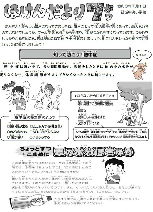 ほけんだより7月号です。気温の高い日が続きます。しっかり読んで、熱中症の予防に努めましょう