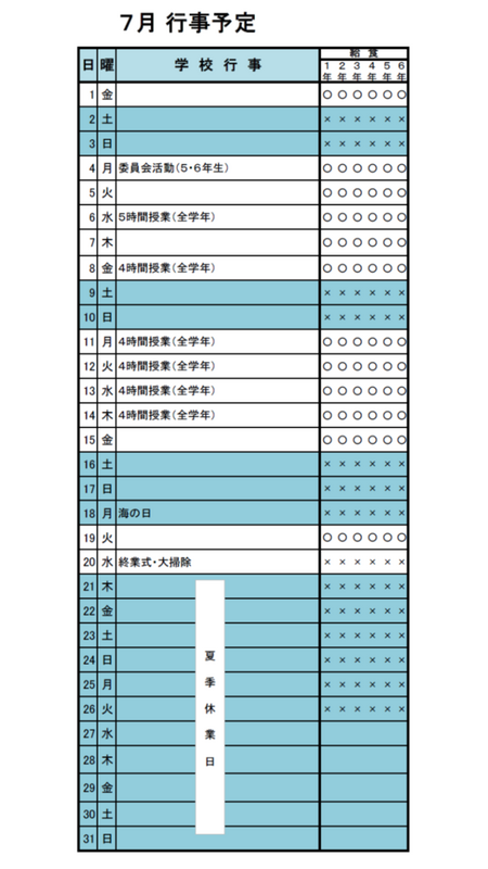 花丸7月の行事予定です。感染症の拡大状況やその他の理由により変更の場合があります。必ず、学級通信にてご確認をお願いします。また、下校時刻につきましても学級通信にてお知らせいたします。