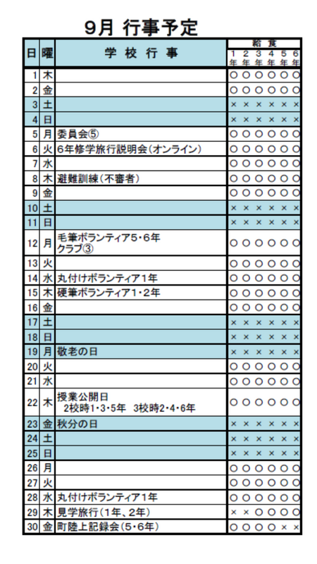 花丸9月の行事予定です。感染症の拡大状況やその他の理由により変更になる場合があります。必ず、学級通信にてご確認をお願いします。また、下校時刻につきましても学級通信にてお知らせいたします。