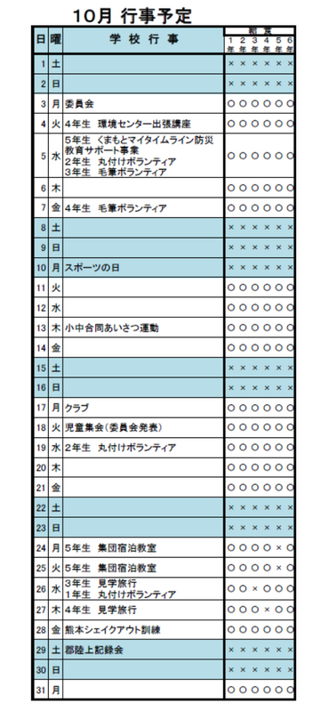 花丸10月の行事予定です。感染症の拡大状況やその他の理由により変更になる場合があります。必ず、学級通信にてご確認をお願いします。また、下校時刻につきましても学級通信にてお知らせいたします。