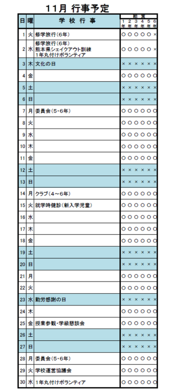 花丸11月の行事予定です。感染症の拡大状況やその他の理由により変更になる場合があります。必ず、学級通信にてご確認をお願いします。また、下校時刻につきましても学級通信にてお知らせいたします。