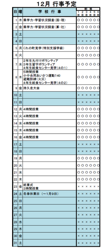 花丸12月の行事予定です。感染症の拡大状況やその他の理由により変更になる場合があります。必ず、学級通信にてご確認をお願いします。また、下校時刻につきましても学級通信にてお知らせいたします。
