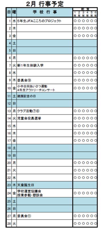 花丸2月の行事予定です。感染症の拡大状況やその他の理由により変更になる場合があります。必ず、学級通信にてご確認をお願いします。また、下校時刻につきましても学級通信にてお知らせいたします。