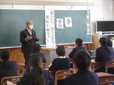 地域の方々による6年生に向けた、体験をもとにした貴重なお話です。経験豊富な方の話を聞くことで、自他のことや将来のことへの思いを深め、夢や目標を持つことをねらった取り組みです。