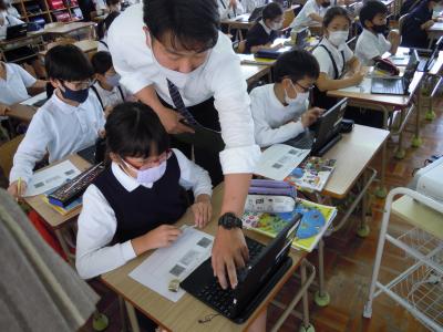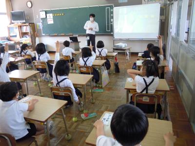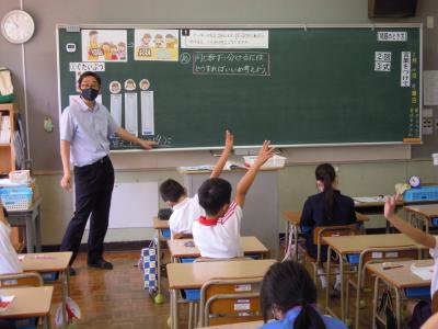 本日、宇城市教育委員会の中村教育審議員と吉永教育審議員が本校を訪問され、横山先生(5年1組:体育)・坂下先生(1年1組:算数)・田代先生(4年1組:社会)・津志田先生(3年1組:算数TT)が授業を公開しました。4人の先生方の頑張りに応えるように、どの学級の子どもたちも、いつもに増して張り切って授業に参加していたのが、印象的でした。