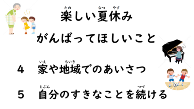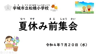 夏休みは、普段できないことにチャレンジできるよい時期です。コロナ渦ではありますが、松小のみなさんにとって素敵な夏休みになることを願っています。また、8月30日に、元気な子供たちと会えることを楽しみにしています。