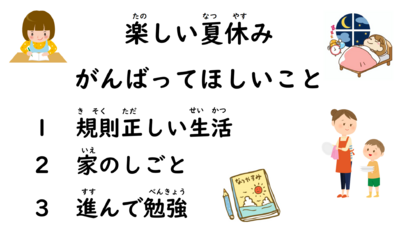 校長先生、生徒指導の先生、養護の先生より、この4か月の生活の振り返り、夏休みに頑張ってほしいことについてのお話がありました。