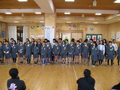 6年生と第一中学校の生徒が一緒にあいさつ運動をしました。