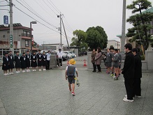 6年生と第一中学校の生徒が一緒にあいさつ運動をしました。