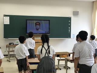 新型コロナウイルス対策のため、ZOOMを使って、それぞれの教室で校長先生のお話を聞きます。