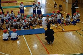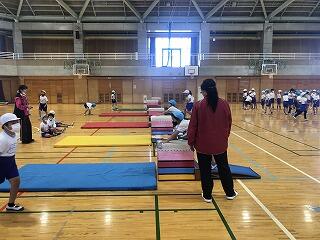 校長先生や教頭先生方、それぞれの主任の先生が見守る中、頑張ってマット運動に取り組んでいました。