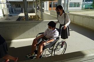 今日は4年生が総合的な学習の時間で車いすの体験をしていました。