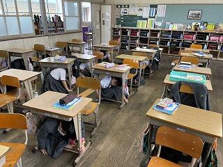 今日は朝の時間に明日の地震シェイクアウト訓練に向けて、地震の時の身の守り方についての学習をしました。