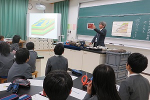 本校理科室で理科のネットワーク授業がありました。この日は、御船恐竜博物館の先生が化石についての授業を行いました。6年生は、大変興味深そうに授業を受けていました。