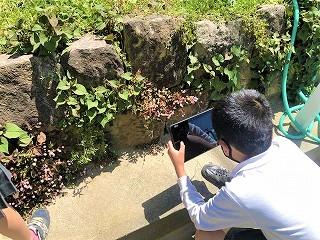 校庭ではタブレットを活用して、動植物の様子を記録する姿が見られました。