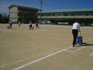 放課後のグラウンドでは、明日の交通教室に向けて線を引く様子が見られました。