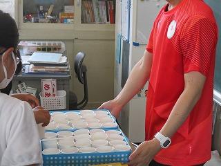 給食の様子です。コロナ対策で、班を作らず前向きに食べています。
