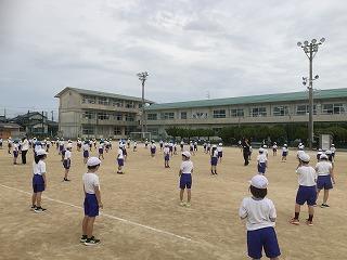 今日はとてもよい天気、プール前の運動も声を出さずに静かにします。