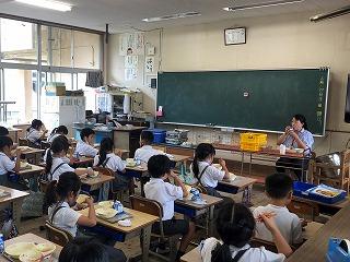 給食の様子です。コロナ対策で、班を作らず前向きに食べています。