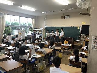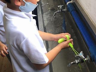 掃除後の1年生教室です。コロナウイルス対策で手洗いタイムを設定しています。きちんと石けんを使って手を洗っている様子が見られました。