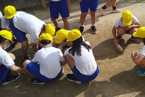 上の写真は、水がしみ込んだり流れたりする土の違いを確かめるため、砂場とバックネット裏の土を採取しているところです。