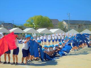5年生では旗を使った演技がとてもきれいでした。旗を振る「バサッ!」という音もそろっていました。