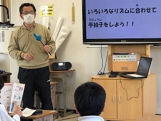 歌や楽器ができないために、手を叩いたり、体を動かしたりしてリズムを楽しむ活動をしていました。
