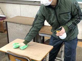 猛威を振るう新型コロナウイルスへの対応で、机等を消毒する職員の姿が見られます。