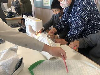 地域学校協働活動の一環として、「学校応援団」の皆様にミシン学習の補助をしていただきました。