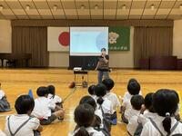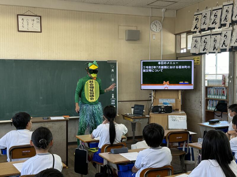 子供たちは、カッパ先生(八代市立社会福祉協議会 松山さん)と一緒に学習しました。これまでに起きた災害のことや災害への備えについてのカッパ先生のお話を熱心に聞いていました。