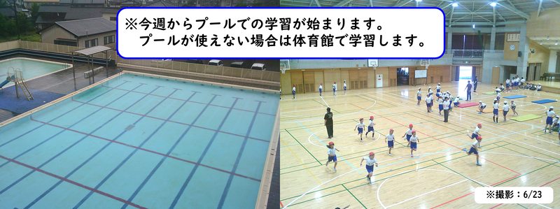 今週からプールでの学習が始まります。ただし、天候等によって実施できない場合もあります。