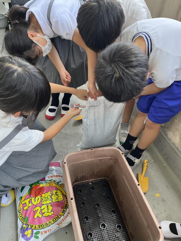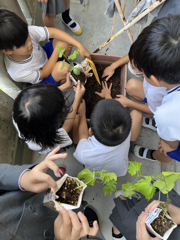 理科の学習で、ツルレイシを育てています。大きさ、形、色、高さなどを見て、観察カードに記録しています。先日は、ポットから鉢への植え替えを行いました。成長が楽しみです。