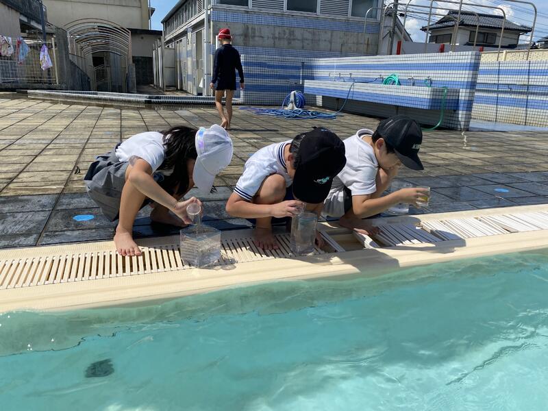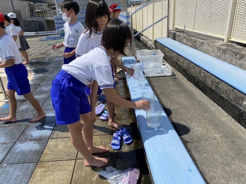 今、2年生は算数で水のかさの学習をしています。プールに行き、1Lますや1dLますを使って水のかさを測りました。
