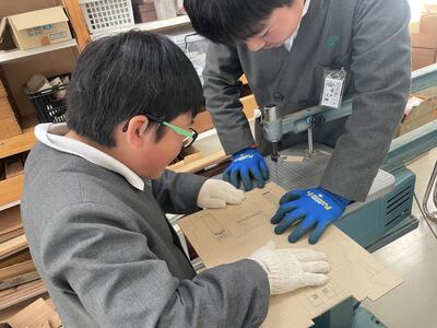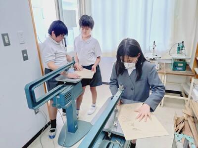 5年生最後の図工では、糸のこで板を切り、ホワイトボード伝言板を作成しています。