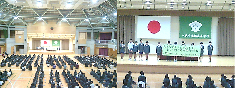 その後、「令和7年度やつしろの笑顔・未来を創る児童生徒表彰」に入賞した「6名」が紹介され、賞状が渡されました。大変素晴らしいことです。全校に大きな拍手が響いていました。