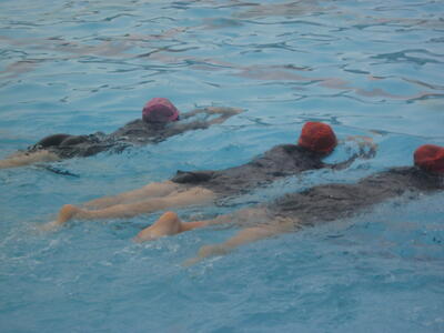 5・6年生のプールでの学習は、クロールや平泳ぎで泳ぐことができるようになることを目指しています。その基本となる伏し浮きや蹴伸びをきれいにできるように頑張っているところです。