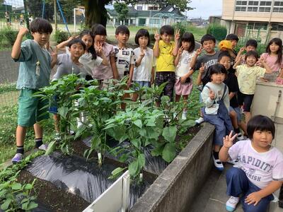 学級園に植えた野菜に実がなりました。子どもたちみんなで、ナスやピーマン、きゅうりの収穫をしました。収穫した野菜は、子どもたちに持ち帰らせています。