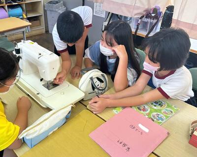 5年生は、家庭科でミシンの学習が始まりました。ミシンを使ってできた物を授業中に出し合い、「手縫いとミシン縫いのちがいとよさ」、「ミシンの使い方」について学習しました。ミシンの学習がとても楽しみなようで、ミシンを目の前にして目を輝かせていました。これから、トートバッグ作りを頑張ります!!