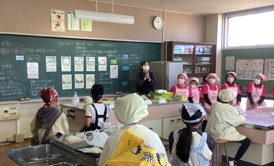 12月9日(月)に5年1組、11日(水)に5年2組が家庭科の調理実習をしました。今回チャレンジしたのは、ご飯と味噌汁でした。ご飯は炊飯器ではなく鍋で炊きました。味噌汁は、班ごとに具を話し合って決め、定番の豆腐やワカメ、ネギなどの他にコーンを入れている班もありました。自分たちで作った味噌汁がとてもおいしかったようで、何杯もおかわりをしていました。振り返りでは、家族にも食べさせてあげたいと話していました。調理中は食生活改善推進協議会の方にもお手伝いいただきました。