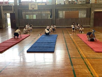 5・6年生の体育では、マット運動に取り組んでいます。高学年なので、飛び込み前転や伸膝後転などの難しい技に挑戦する児童もいて、楽しそうに頑張っています。
