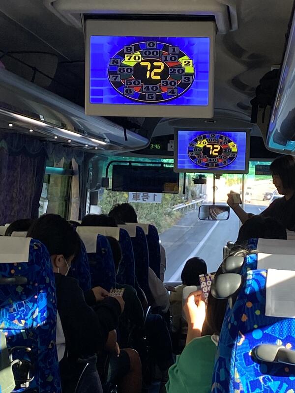 バス内でビンゴやゲームをしながら過ごしています。八代インター付近に花火による渋滞情報がありますが、解消を願っているところです。4時50分頃に到着予定時刻をお伝えします。