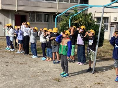 3年生は、理科で、太陽と影の位置について学習しています。初めて遮光板を使って太陽を見た子どもたちは、「太陽が丸い!」「緑色に見える!」「動いているように見える!」など、新しい発見に大興奮でした。