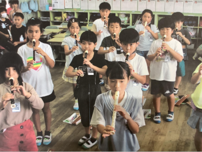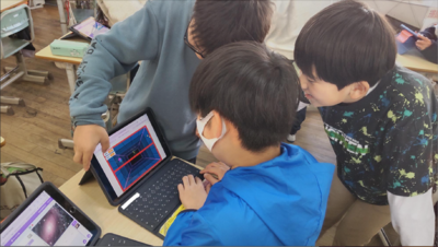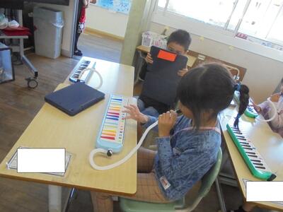 鍵盤ハーモニカで色々な曲を弾くことができるようになっています。友達の演奏を聴き合うために、タブレットパソコンで動画に撮って見直しています。その後、良いところを見つけて伝え合っています。
