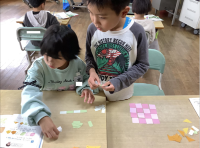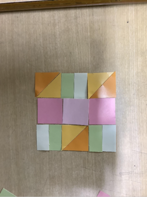 2年生は、算数の「三角形と四角形」の単元で、正方形・長方形・直角三角形などの図形を学習しました。正方形・長方形・直角三角形の色紙を使って、いろいろな模様を作りました。